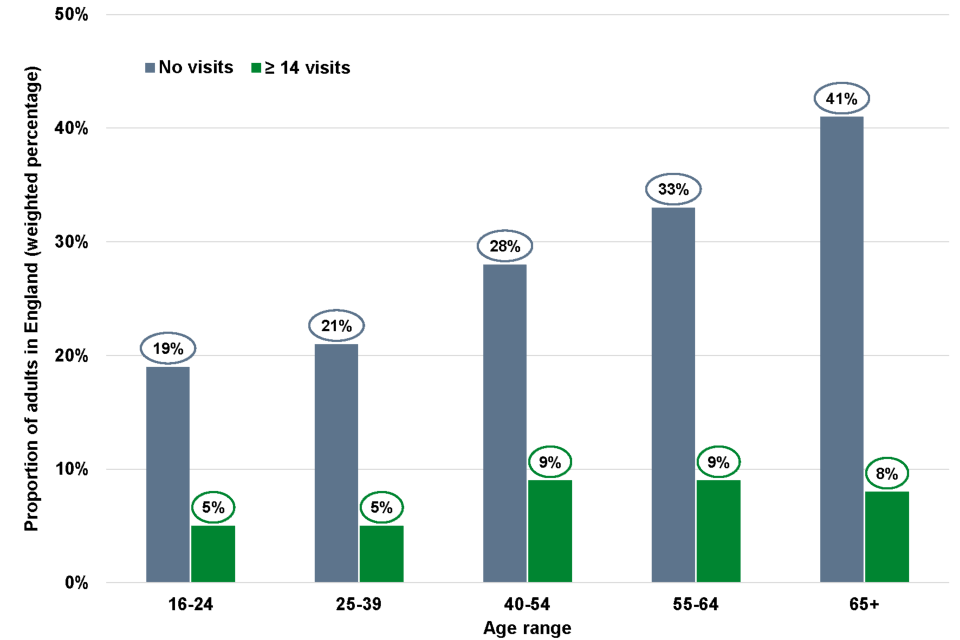 Figure 2: Proportion of adults in England (weighted percentage) grouped by age range who had visited a green and natural space at least 14 times in the last 14 days versus those who had not taken a visit in the last 14 days. As age increases, so does the proportion of those reporting no visits to a green and natural space in the last 14 days. However, people aged 40+ were more likely than those under 40 to have visited green and natural spaces at least 14 times in the last 14 days.