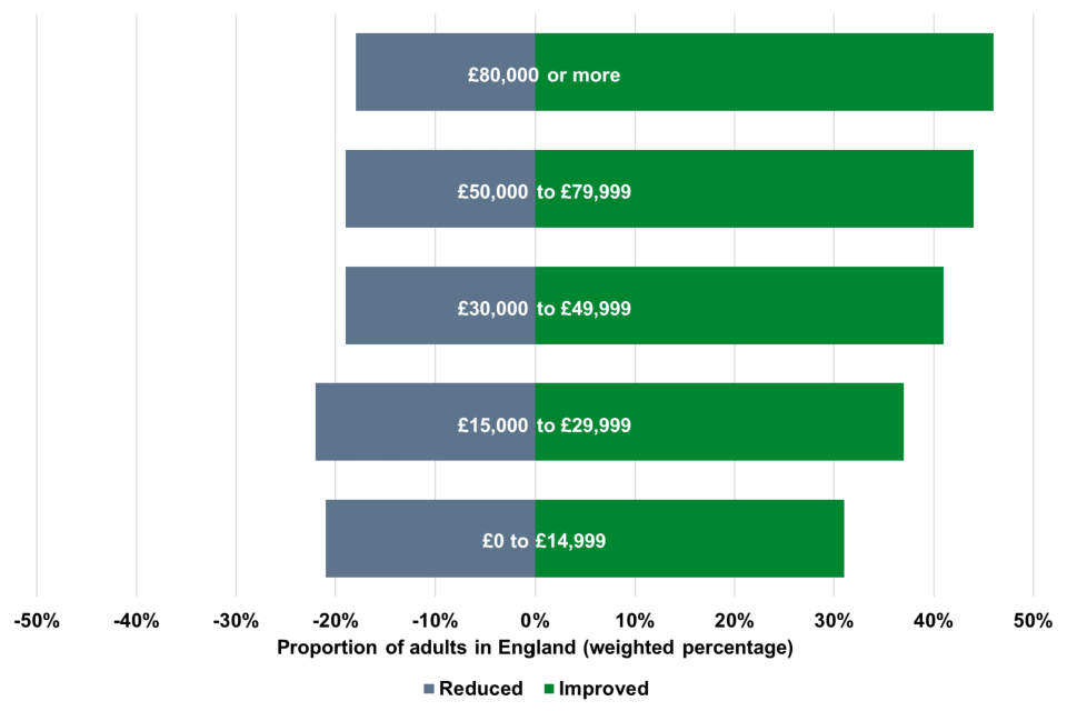 - Adults from households with higher income (>£50k) were more likely to say that quality of green and natural spaces had improved over the last 5 years (45%) than those with a lower income (e.g. 31% of those with a household income <£15k.