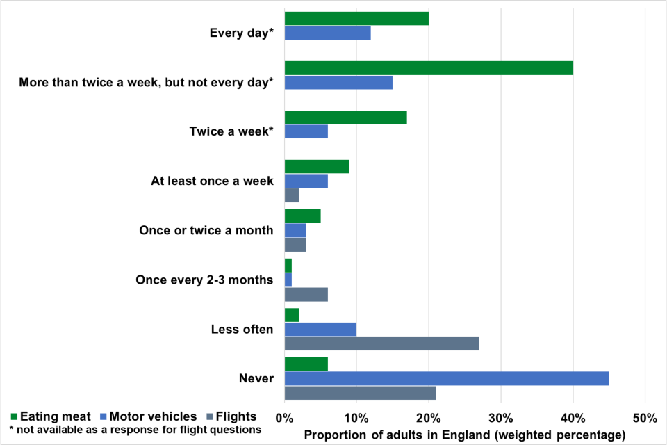 Proportion of adults in England how often eating meat, making journeys by motor vehicles and taking flights