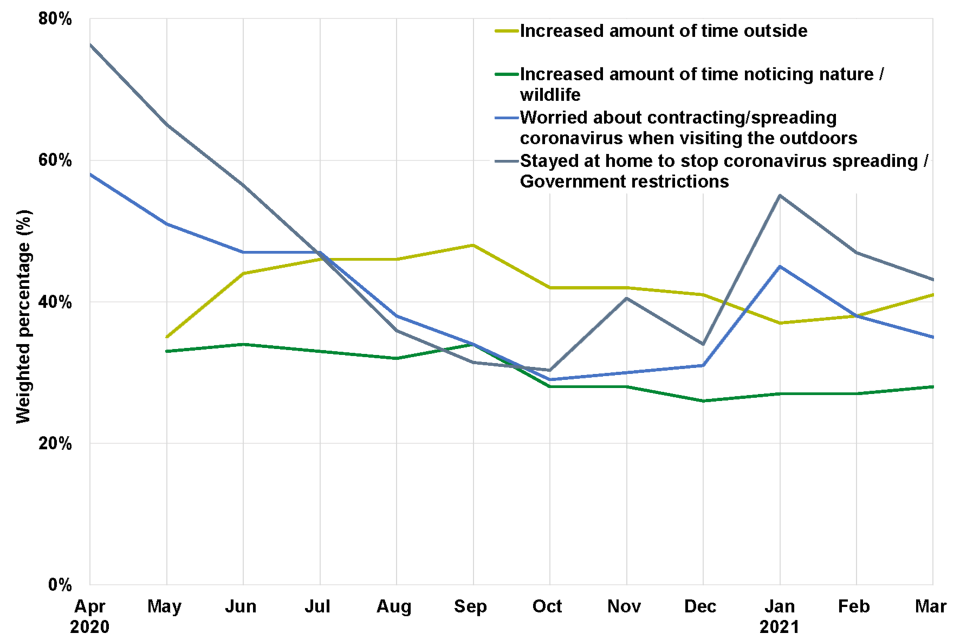 - Just over 4 in 10 (42%) people agreed that they had increased their time spent outside, and nearly a third (30%) agreed that they had increased the amount of time they spent noticing nature and wildlife since the start of coronavirus restrictions.