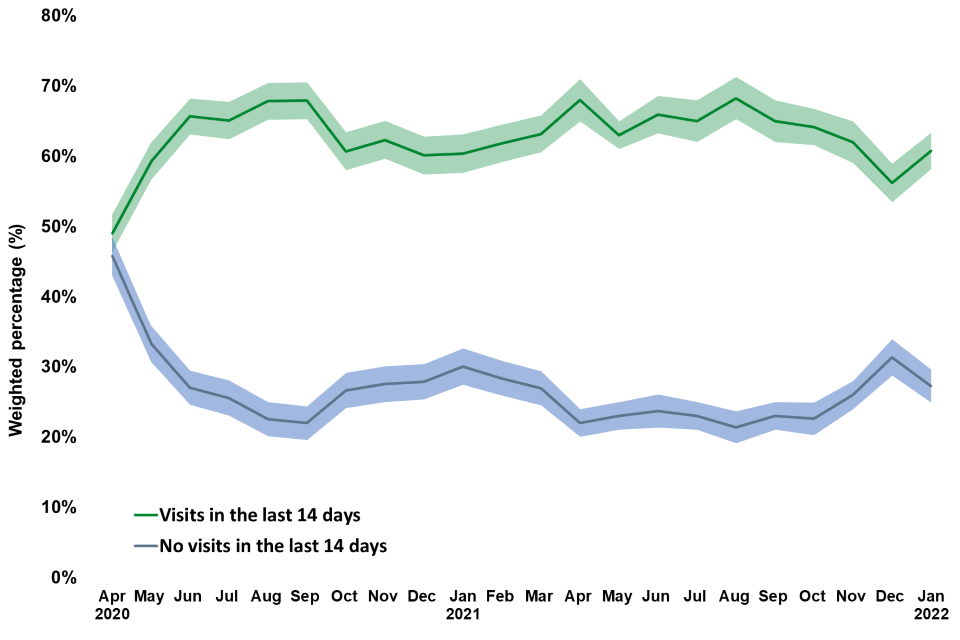 Visits and no visits in the last 14 days April 2020 to January 2022