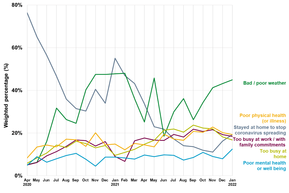 Figure 4: The top three reasons for not spending free time outdoors in the last 14 days (January 2022) were ‘Bad / poor weather’ (45%), ‘Poor physical health (or illness)’ (19%) and ‘Stayed at home to stop coronavirus spreading / Government restrictions’ (19%). ‘Too busy at work / with family commitments’ (18%) and ‘Too busy at home’ (17%) were the next most stated reasons. Note that only a subset of reasons has been presented - see the supporting data for all reasons.