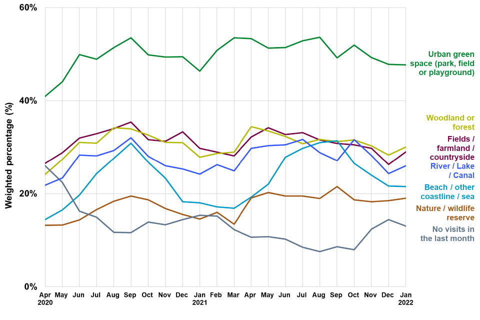 Figure 5: Proportion of adults in England (weighted percentage) visiting different types of green and natural spaces within the last month (April 2020 - January 2022). Urban green spaces have been the most frequently visited across all months. Note that only a subset of types of green and natural spaces has been presented - see the supporting data for all types of green and natural spaces visited during the last month.