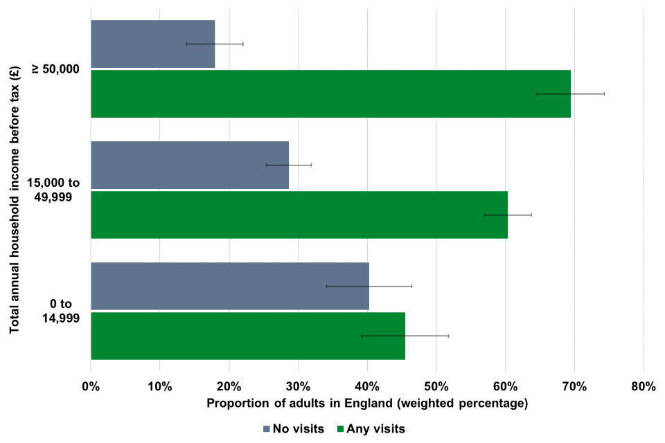 Proportion of adults in England no visits and any visits by total annual household income before tax