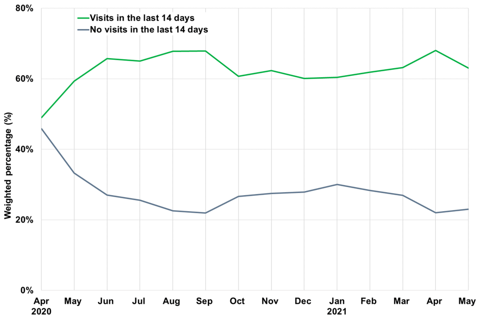 (2) The samples for this question were 958 (April 2020), 754 (May 2020), 647 (June 2020), 605 (July 2020), 569 (August 2020), 567 (September 2020), 676 (October 2020), 687 (November 2020), 729 (December 2020), 715 (January 2021), 696 (February 2021), 694 (March 2021), 597 (April 2021) and 667 (May 2021) respondents who reported not spending time outdoors in the last 14 days.