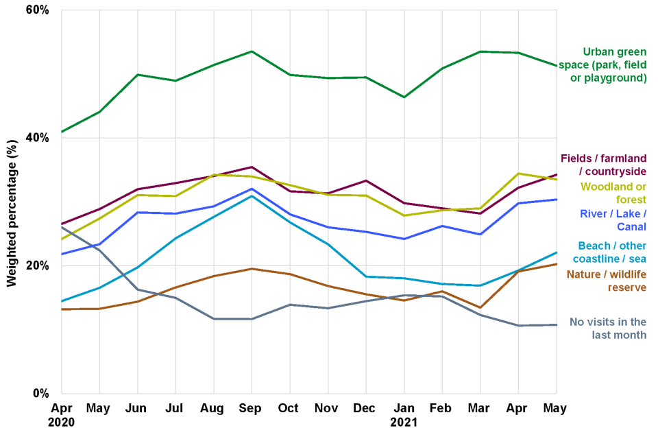 Figure 3: Proportion of adults in England (weighted percentage) visiting different types of green and natural spaces within the last month (April 2020 - May 2021). Urban green spaces have been the most frequently visited across all months. Note that only a subset of types of green and natural spaces has been presented - see the supporting data for all types of green and natural spaces visited during the last month.