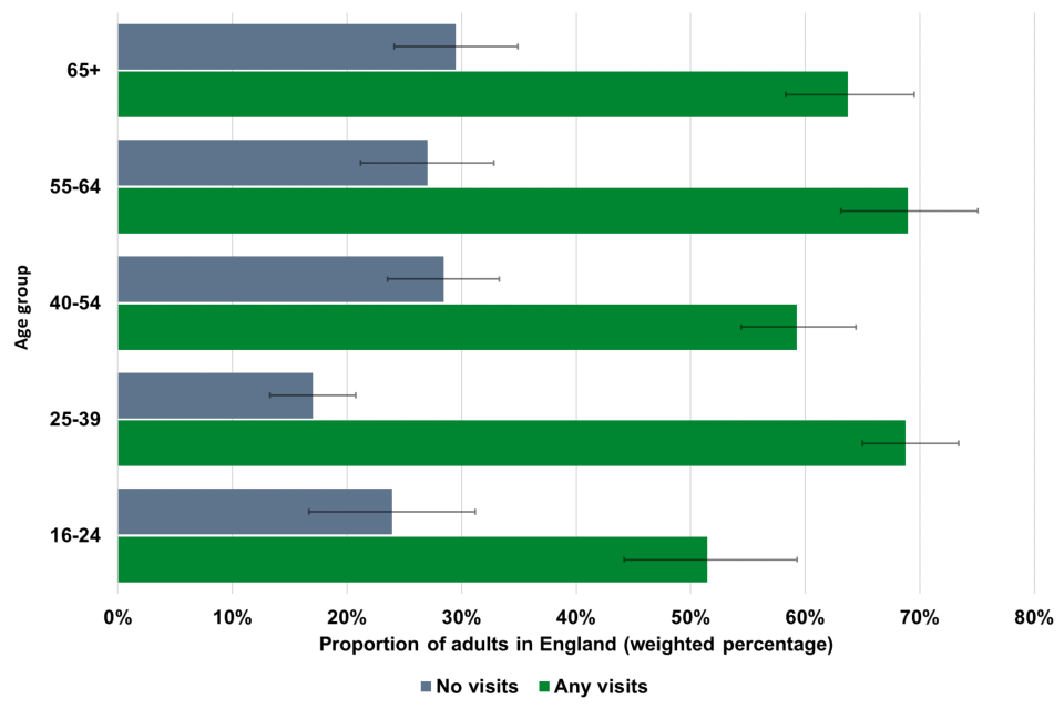 - 30% of adults aged 65+ did not make a visit to a green and natural space in the last 14 days compared to 17% of 25-39 year olds.