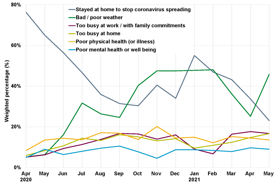 Figure 4: The top two reasons for not spending free time outdoors in the last 14 days (May 2021) were ‘Bad / poor weather (46%) and ‘Stayed at home to stop coronavirus spreading / Government restrictions’ (23%). ‘Too busy at work / with family commitments’ and ‘being too busy at home’ were the next most stated reasons (17%). Note that only a subset of reasons has been presented - see the supporting data for all reasons.