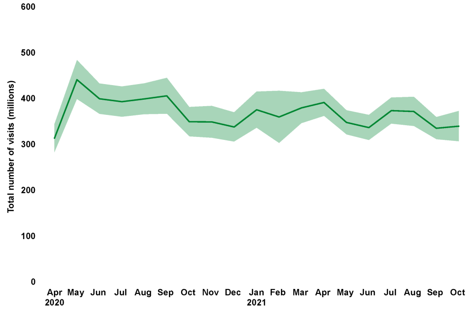 Figure 3 shows the total number of visits made by adults to green and natural spaces in October was 339,862,313, an increase on the total number of visits made in September (335,393,971). The peak number of visits was made in May 2020 (441,228,000).