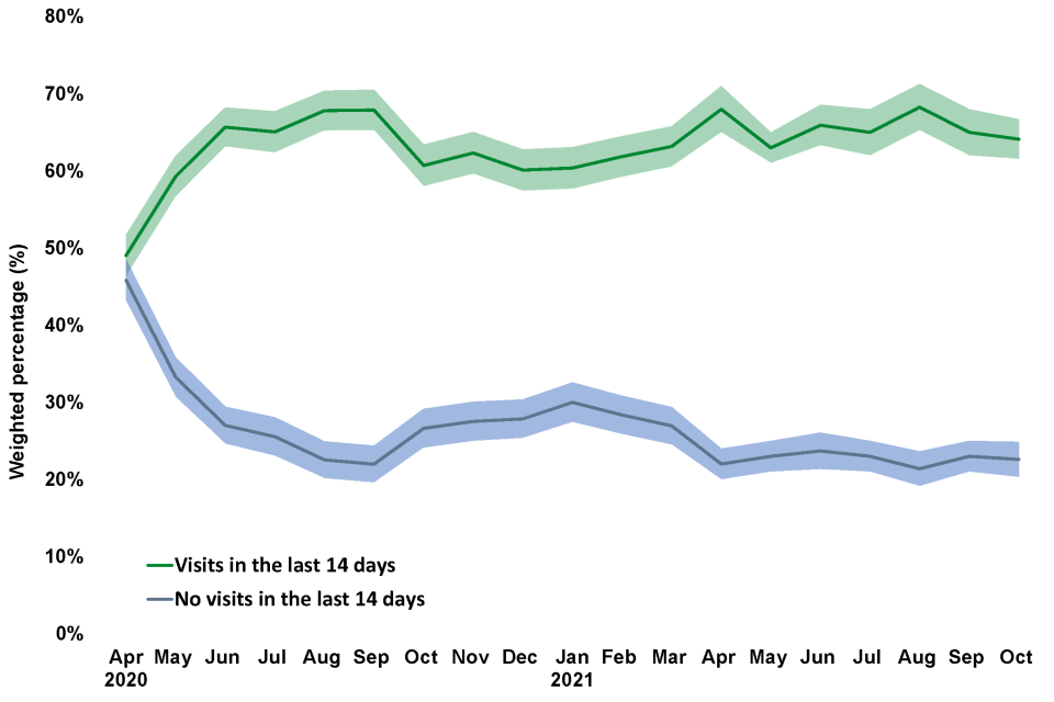 Figure 1: The proportion of adults in England (weighted percentage) visiting a green and natural space in the last 14 days. In October, 64% per cent of adults in England said that they had spent time outside in green and natural spaces in comparison to 23% who had not.