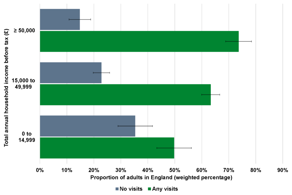 Proportion of adults in England no visits and any visits by total annual household income before tax
