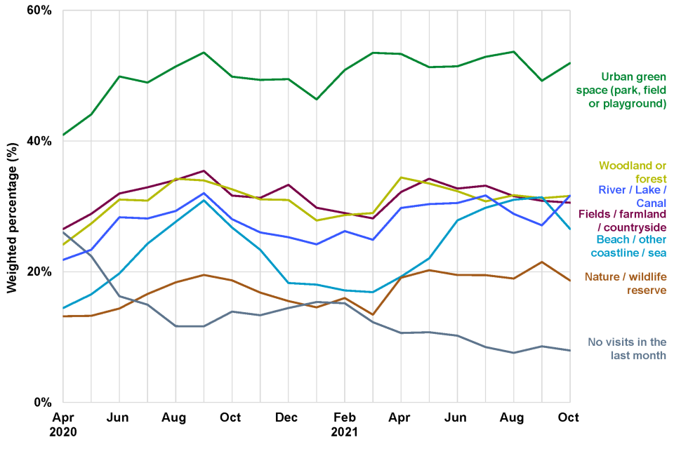 Figure 5: Proportion of adults in England (weighted percentage) visiting different types of green and natural spaces within the last month (April 2020 - October 2021). Urban green spaces have been the most frequently visited across all months. Note that only a subset of types of green and natural spaces has been presented - see the supporting data for all types of green and natural spaces visited during the last month.