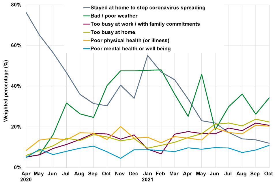 Figure 4: The top two reasons for not spending free time outdoors in the last 14 days (October 2021) were ‘Bad / poor weather’ (34%) and ‘Too busy at home’ (22%). ‘Too busy at work / with family commitments’ (21%) and ‘Poor physical health (or illness)’ (20%) were the next most stated reasons. Note that only a subset of reasons has been presented - see the supporting data for all reasons.