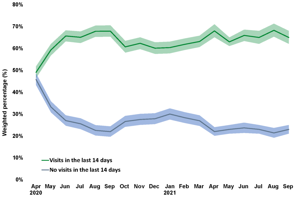 Figure 1: The proportion of adults in England (weighted percentage) visiting a green and natural space in the last 14 days. In September, 65% per cent of adults in England said that they had spent time outside in green and natural space in comparison to 23% who had not.