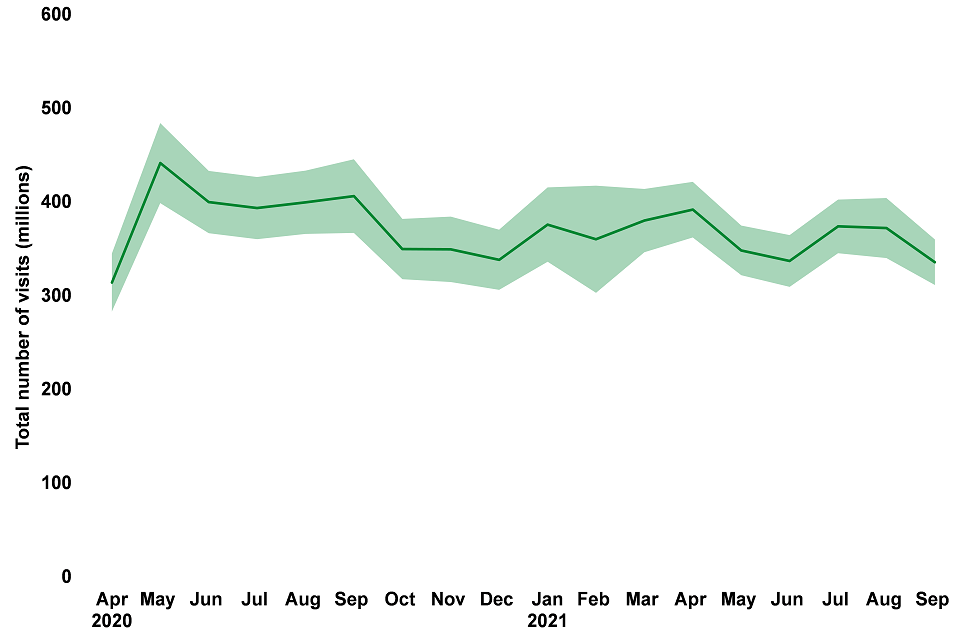 Figure 3 shows the total number of visits made by adults to green and natural spaces in September (335,392,971) which was lower than the visits made in August (371,906,804). The peak number of visits was made in May 2020 (441,228,000).