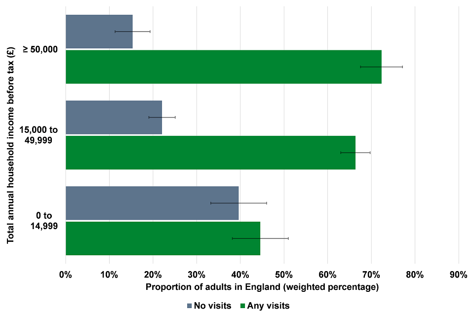 Proportion of adults in England no visits and any visits by total annual household income before tax