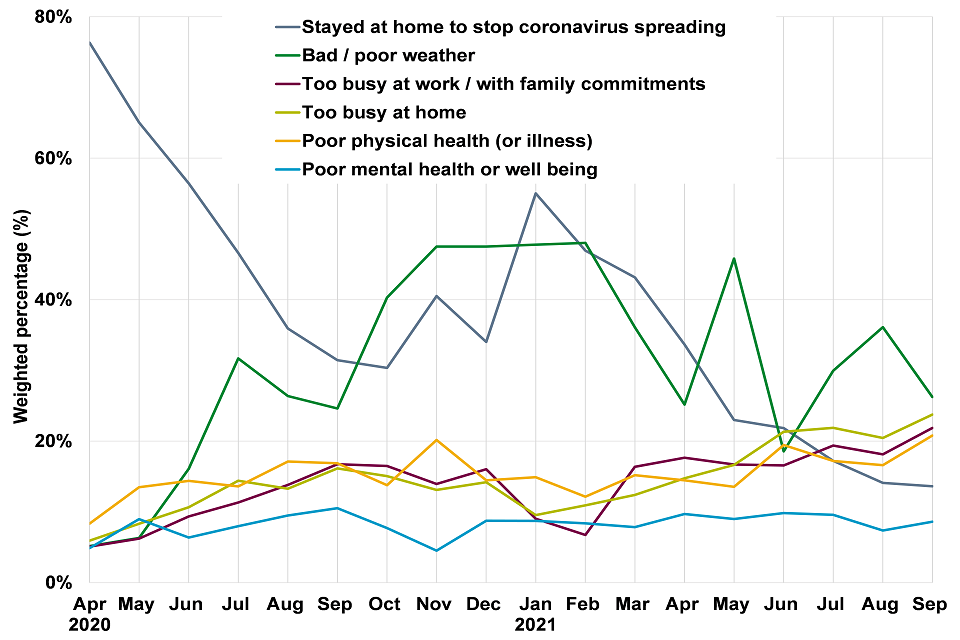 Figure 4: The top two reasons for not spending free time outdoors in the last 14 days (September 2021) were ‘Bad / poor weather’ (26%) and ‘Too busy at home’ (24%). ‘To busy at work / with family commitments’ (22%) and ‘Poor physical health (or illness)’ (21%) were the next most stated reasons. Note that only a subset of reasons has been presented - see the supporting data for all reasons.
