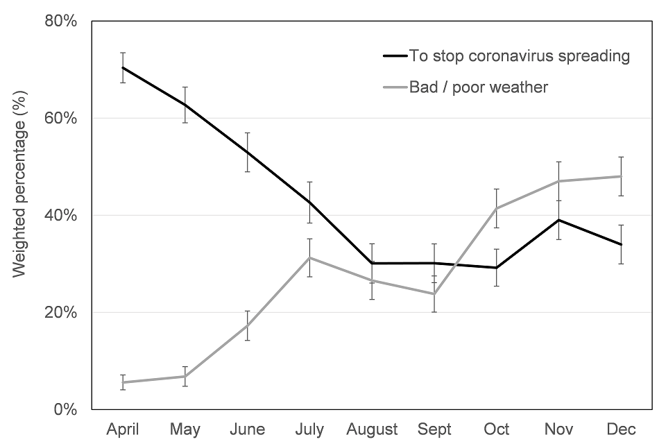 (2) The sample for this question were 958 (April), 754 (May), 647 (June), 605 (July), 569 (August), 567 (September), 676 (October), 687 (November) and 729 (December) respondents who reported not spending time outdoors in the last 14 days.