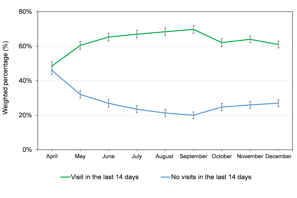 Figure 1: The proportion of adults in England (weighted percentage) visiting green and natural spaces since coronavirus restrictions has overall increased since April 2020. In December, sixty one per cent of adults made a visit to a green and natural space in the previous 14 days. Twenty seven per cent of adults had not visited a green and natural space in the previous 14 days.