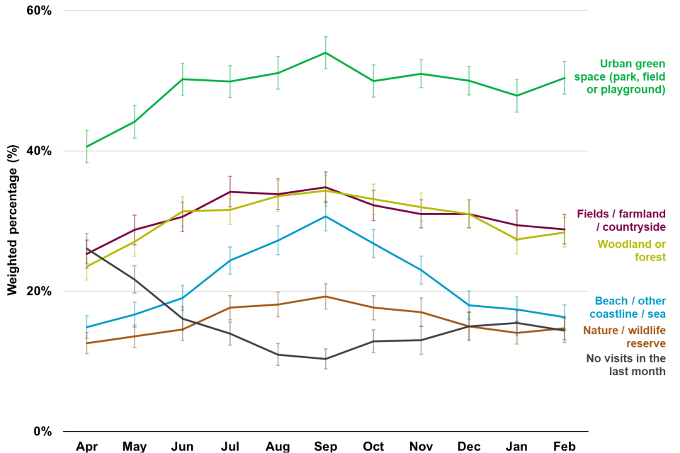 (1) Data collected between April 1st 2020 and February 28th 2021 (inclusive). (2) The samples for this question were 2,017 (April), 2,015 (May), 2,001 (June), 2,024 (July), 2,009 (August), 2,021 (September), 2,021 (October), 2,022 (November), 1,994 (December), 1,972 (January) and 1,957 (February) respondents. (3) Error bars represent the 95% confidence interval of the mean (see Glossary). (4) Respondents can select more than one option and so percentages will not add up to 100%. (5) Only a subset of types of green and natural space have been presented - see the supporting data for all green and natural spaces.