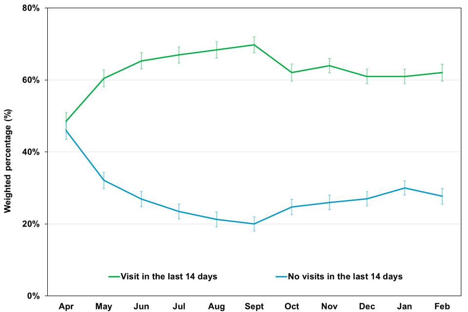 Figure 1: The proportion of adults in England (weighted percentage) visiting green and natural spaces during the previous fortnight has increased overall since April 2020. In February, sixty two per cent of adults made a visit to a green and natural space in the previous 14 days. Twenty eight per cent of adults had not visited a green and natural space in the previous 14 days.