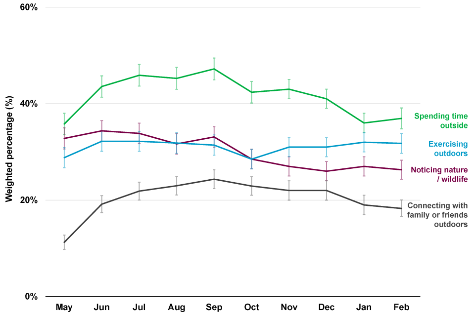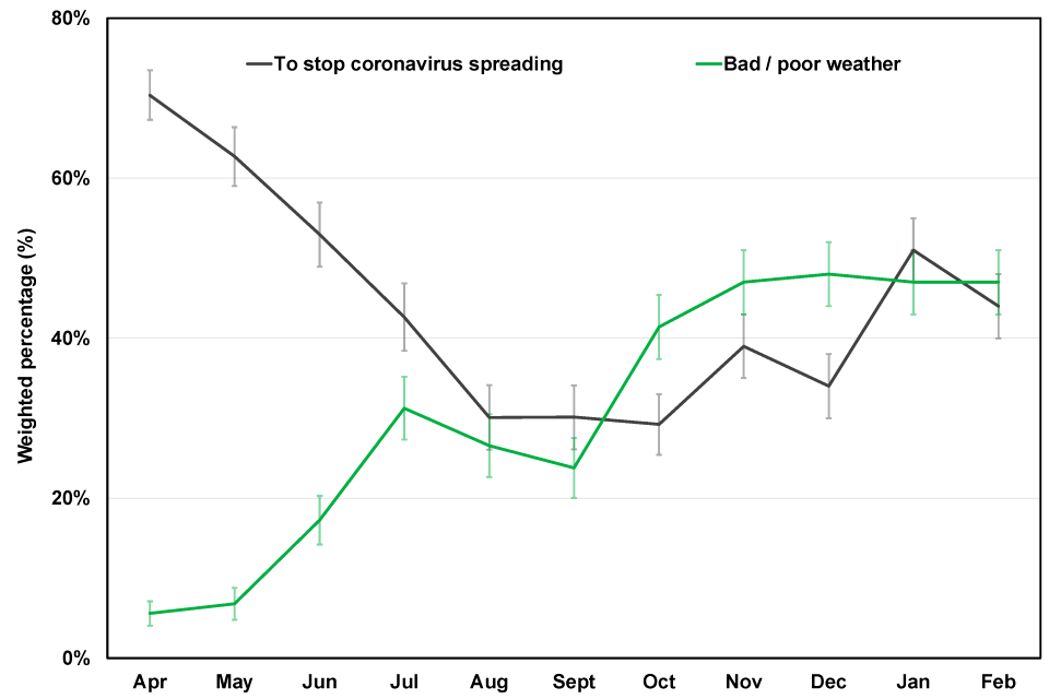 • For adults who did not spend time outdoors in the last 14 days, the most reported reason was bad / poor weather, cited by 47 per cent. 44% stayed at home to stop coronavirus spreading / due to Government restrictions (down from 51% in January).