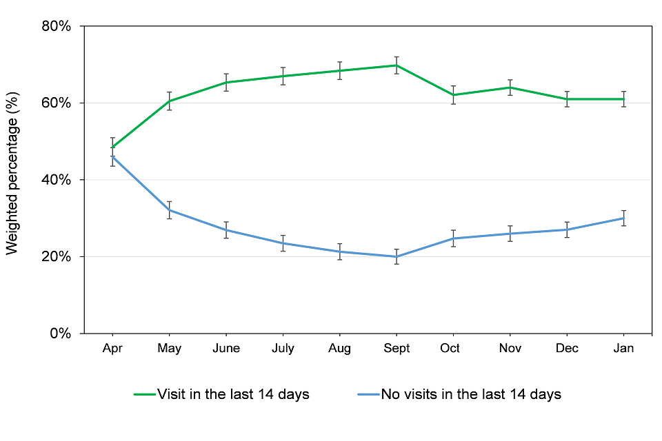 Figure 1: The proportion of adults in England (weighted percentage) visiting green and natural spaces since coronavirus restrictions has overall increased since April 2020. In January, sixty one per cent of adults made a visit to a green and natural space in the previous 14 days. Thirty per cent of adults had not visited a green and natural space in the previous 14 days.