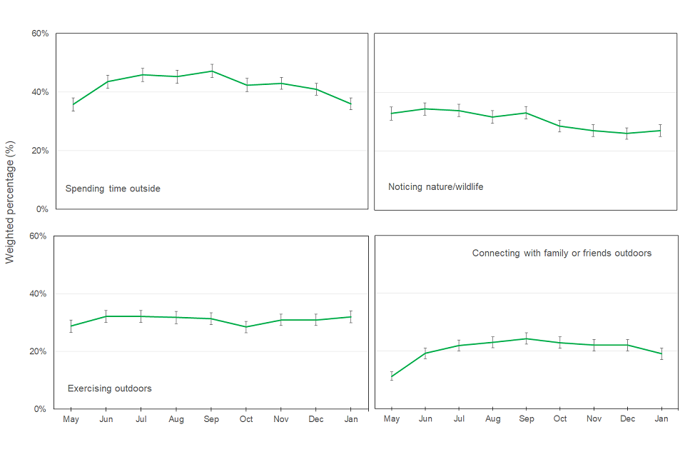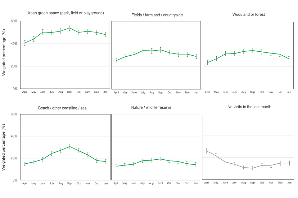 - During January, national lockdown restrictions in England do not appear to have had an effect on the proportion of adults visiting green and natural spaces. In January, almost two thirds of the adult population (61%) had visited a green and natural space in the last 14 days, which was consistent with December (61%) and November (64%).
