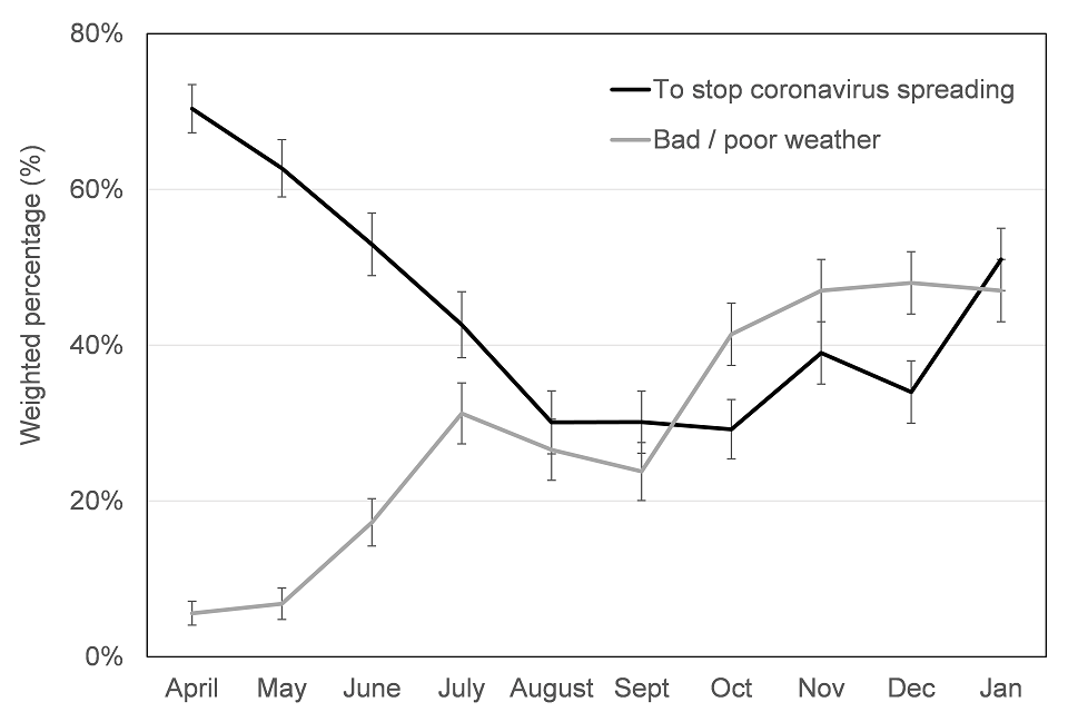 The survey asked adults about their reasons for not spending time in green and natural spaces during the previous 14 days. In January, the main reason was ‘Stayed at home to stop coronavirus spreading / Government restrictions’ reported by 51% of adults (up from 34% in December). Between April and October, there was a month-on-month decrease in the figure (70% in April to 29% in October; see Figure 4). Other main reasons reported for not getting out were: bad / poor weather (47%), poor physical health or illness (12%), being too busy at home (10%), or at work / family commitments (9%).