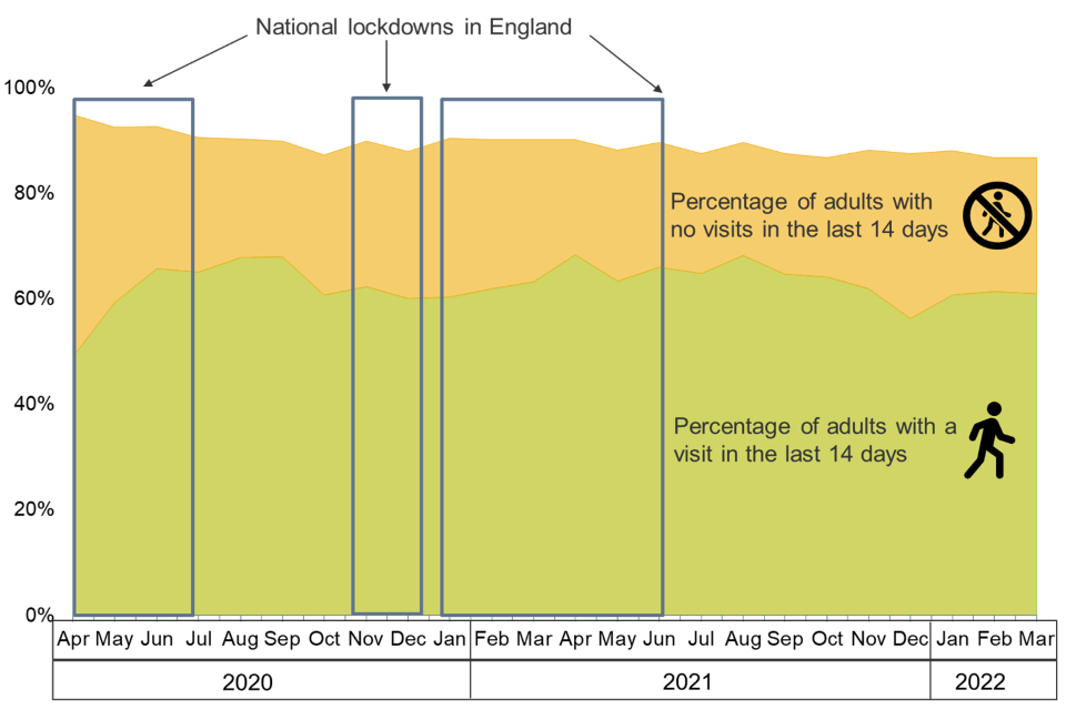 Trends in percentages of adults making visits during national lockdowns in England March 2020 to April 2022