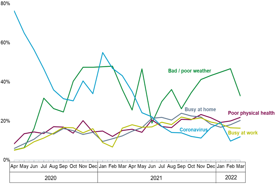 Concerns about contracting or spreading coronavirus were no longer the most common factors reported that stopped people spending time outdoors between April 2021 and March 2022 (Year 2)