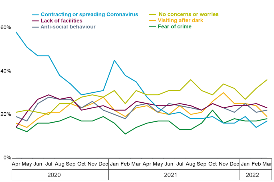 Chart 3-3 Concerns or worries about visiting green and natural spaces for people that had not visited green and natural spaces in the previous 14 days. Data from April 2020 to March 2022.