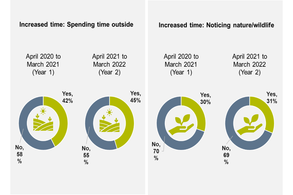 - Four in ten adults reported that they had increased their time spent outside (42% between April 2020 and March 2021 and 45% between April 2021 and March 2022). Three in ten agreed that they had increased the amount of time they spent noticing nature and wildlife since the start of the pandemic (30% between April 2020 and March 2021 and 31% between April 2021 and March 2022).