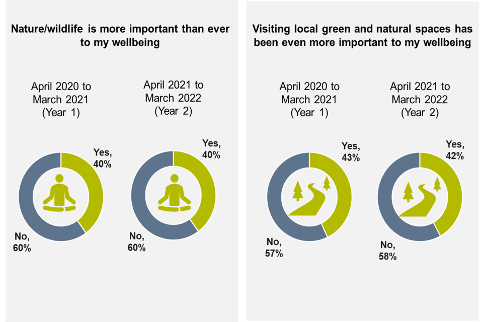 - Four in ten adults reported that nature/wildlife (40% between April 2020 and March 2021 and 40% between April 2021 and March 2022 and ) and visiting green and natural spaces (42% between April 2020 and March 2021 and 43% between April 2021 and March 2022) had been more important to their well-being during the pandemic.