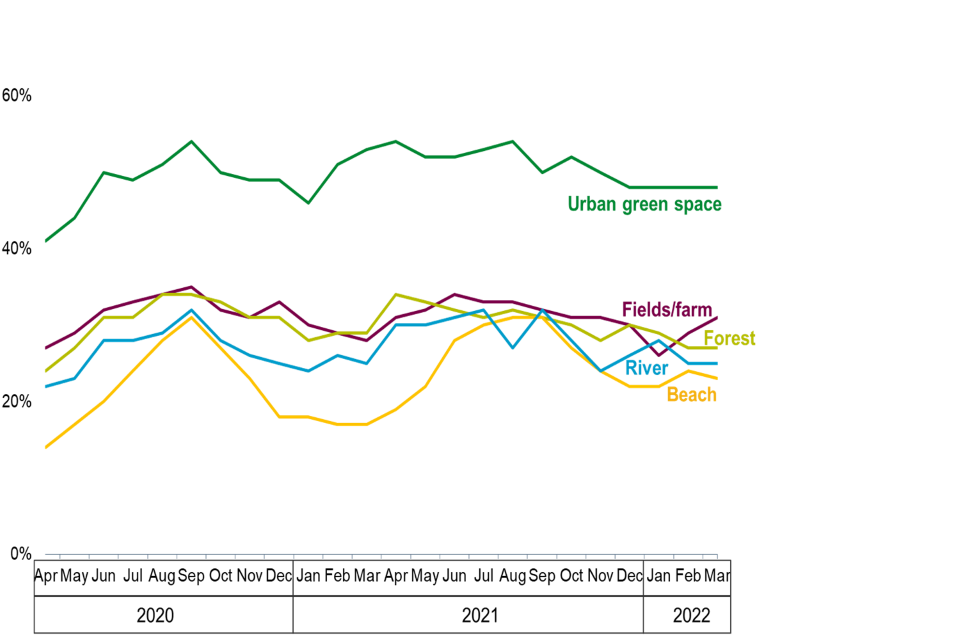 Between April 2020 and March 2022, more than six in ten people (63%) surveyed had visited green and natural spaces in the previous 14 days: