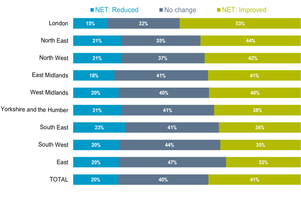 People in London were more likely to agree that the quality of green and natural spaces where they live had improved over the last 5 years (52%). People in the East of England were least likely to agree that green and natural spaces where they lived had improved (33%).
