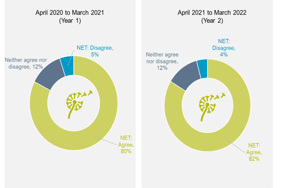- 94% of adults who had visited a green and natural space in the previous 14 days agreed that spending time outdoors was good for their physical health and 92% agreed it was also good for their mental health. The same percentage agreed with both these statements between April 2021 and March 2022 (Year 1) and April 2020 and March 2021 (Year 2).