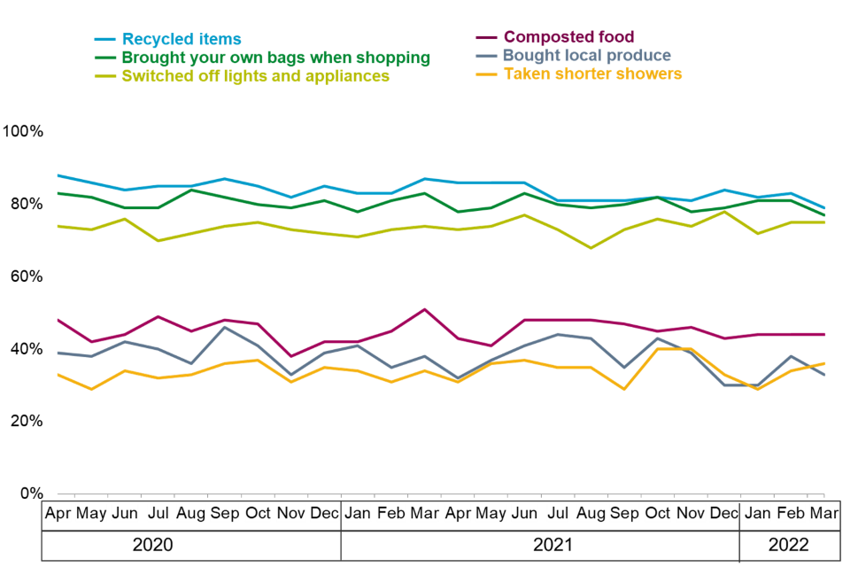 - Respondents were asked what they had done to protect the environment over the last month. Chart 8-1 shows monthly responses between April 2020 and March 2022.