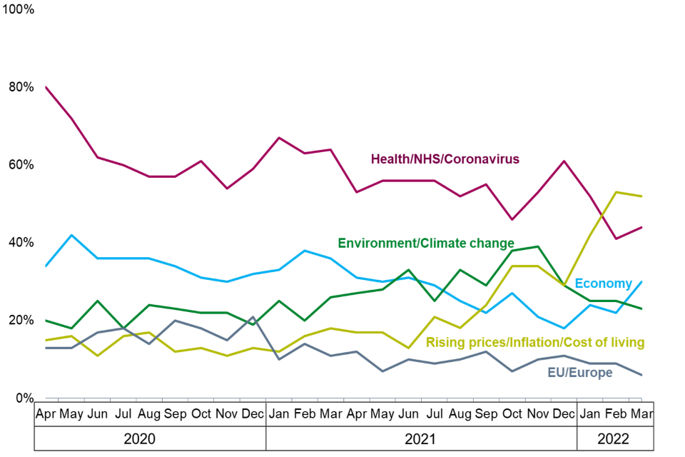 Chart 8-2 What people think are the most important issues facing the UK. Data from April 2020 to March 2022.