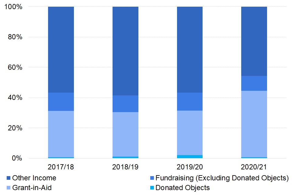 When donated objects are excluded from the fundraising income total, the ratio of fundraising income to Grant-in-Aid decreased to 22.6%, 17.5 percentage points lower than in 2019/2020 (40.1%).