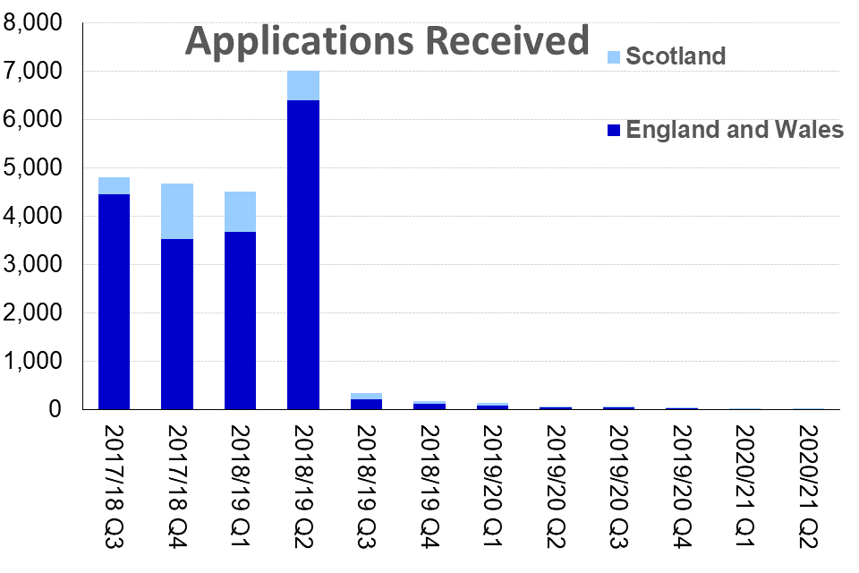 Of the applications received between July to September 2020, 54% (21 applications) related to cases initially brought in England and Wales, down from 87% in the quarter to 30 June 2020. The remaining 46% of applications received this quarter (18 applications) related to cases initially brought in Scotland.