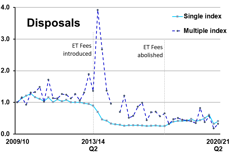 Figure 3.2: Index of Employment Tribunals single and multiple claim disposals, Q1 2009/10 – Q2 2020/21 (Source: Tables S_3)[footnote 1]