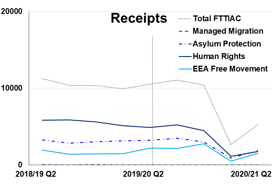 Figure 4.1: First-tier Tribunal Immigration and Asylum Chamber receipts, Q2 2018/19 to Q2 2020/21 (Source: Tables FIA_1)