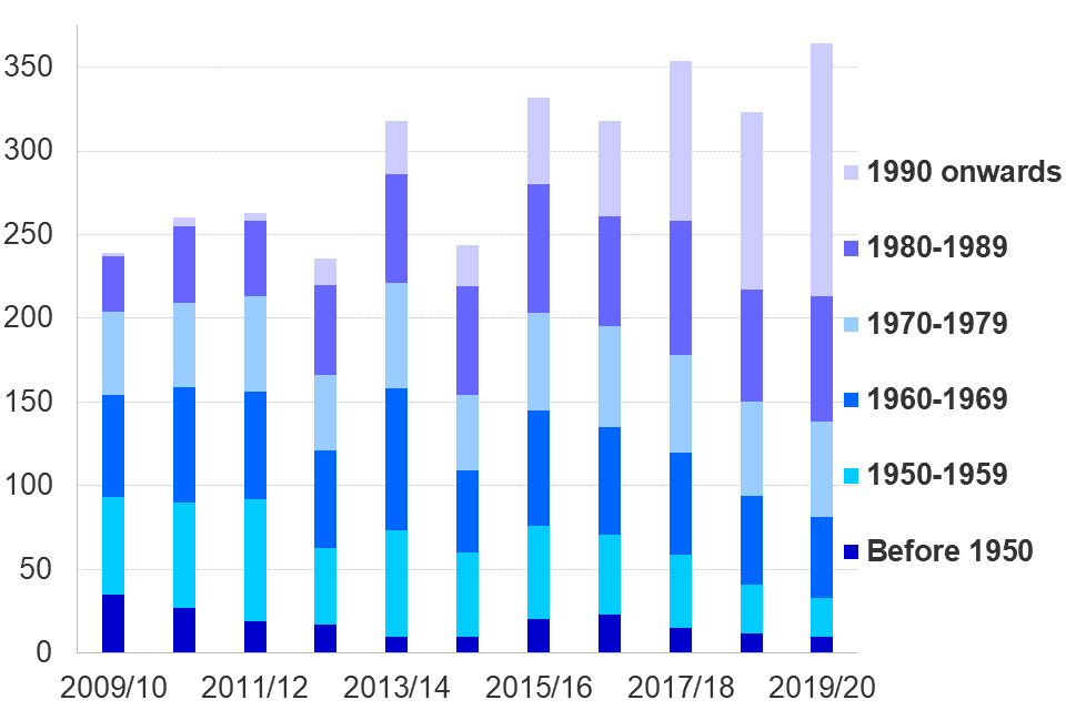 Figure 5.2: Full Gender Recognition Certificates granted by year of birth, 2009/10 to 2019/20 (Source: Table GRP_4)