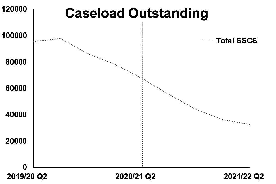 There were 33,000 SSCS cases outstanding at the end of September 2021, down 52% compared to the same period in 2020. This continues the fall that began in Q4 2018/19 (when comparing to the same quarter in the previous year). Since Q4 2017/18, caseload outstanding has been gradually decreasing (from a peak of 125,000), only rising in Q3 2019/20, reversing the consistent rising trend seen since Q4 2015/16.