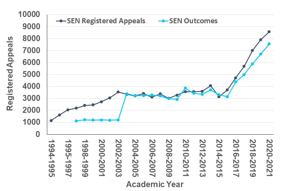 Figure 7.1: Registered SEN appeals, 1994/95 to 2020/21 academic years (Source: Table SEND_1)[footnote 4]