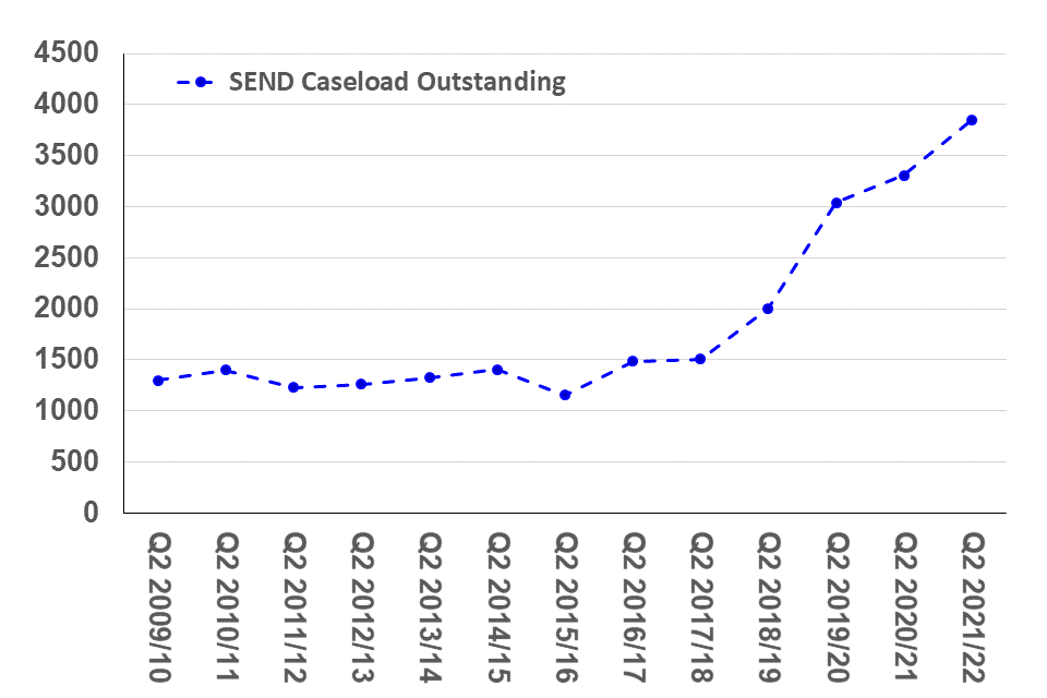 SEND caseload outstanding reached a new high of 3,900 cases in Q2 2021/22, driven by the previously noted rising trend in SEND appeals registered.