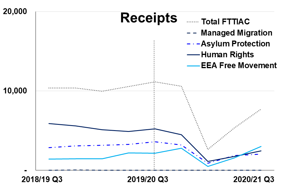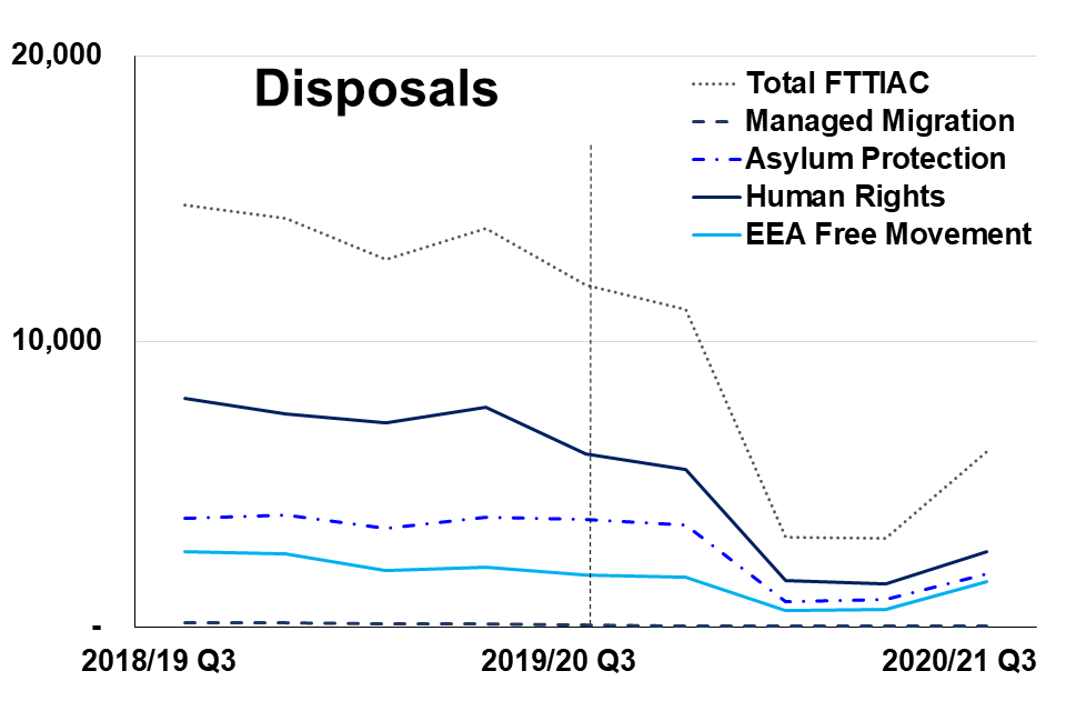 Government C-19 measures put in place for Immigration and Asylum led to a significant drop in both receipts and disposals in the FTTIAC. However, this quarter, we have begun to see growth in receipts for Immigration and Asylum cases as the guidance has ended and decisions on visa applications have restarted. Disposal volumes have doubled compared to the start of the pandemic, although it remains below the levels seen pre-C-19.