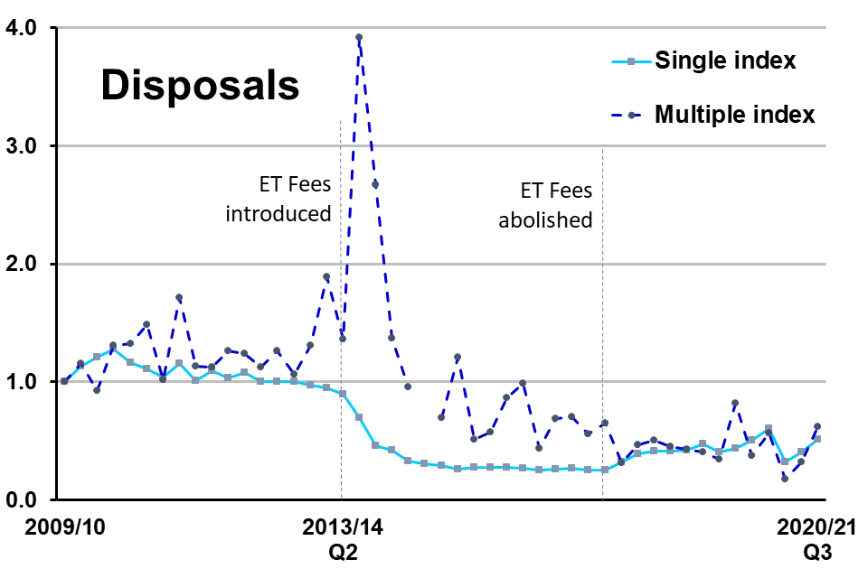 Figure 4.2: Index of Employment Tribunals single and multiple claim disposals, Q1 2009/10 – Q3 2020/21 (Source: Tables S_3)[footnote 1]