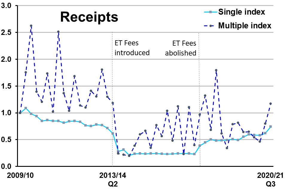 Figure 4.1: Index of Employment Tribunals single and multiple claim receipts, Q1 2009/10 – Q3 2020/21 (Source: Tables S_2)